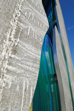 Wirkung entfaltet, wird durch die Staffelung zur Wellenbewegung. Die Acrylglasplatten beleben die Skulptur und erzeugen eine ganz eigenwillige Aura, die sich auch im Umraum entfaltet. Bei Nacht wird dieses Phänomen noch verstärkt, denn das Glas wird von Schwarzlicht bestrahlt, so dass die Umrisse